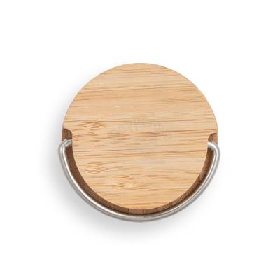 Squeeze em bambu e aço inox, com corpo duplo e isolamento a vácuo. Capacidade até 440 ml. Fornecido em caixa.