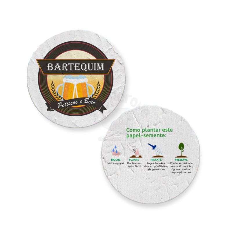 Porta copo ecológico personalizado produzido com papel semente. O porta copo é ideal para proteger seus moveis, possui grande poder de absorção para garantir sua mesa sempre seca e pode ser plantado depois. O brinde perfeito para divulgar sua empresa em eventos corporativos, brindes personalizados e campanhas ecológicas.