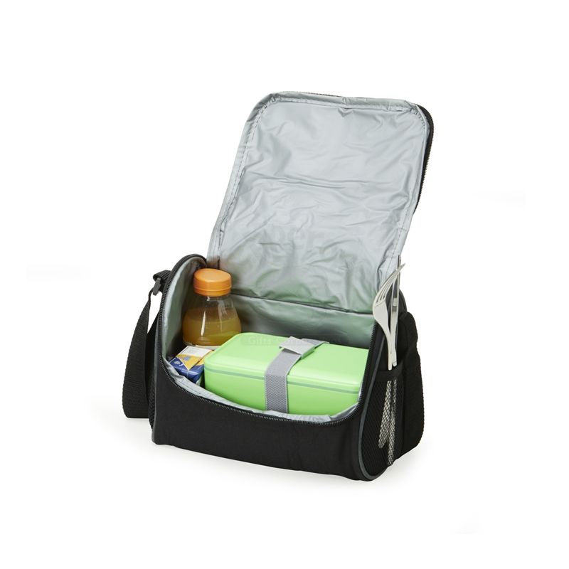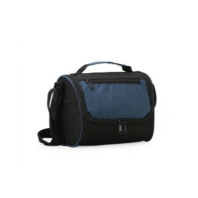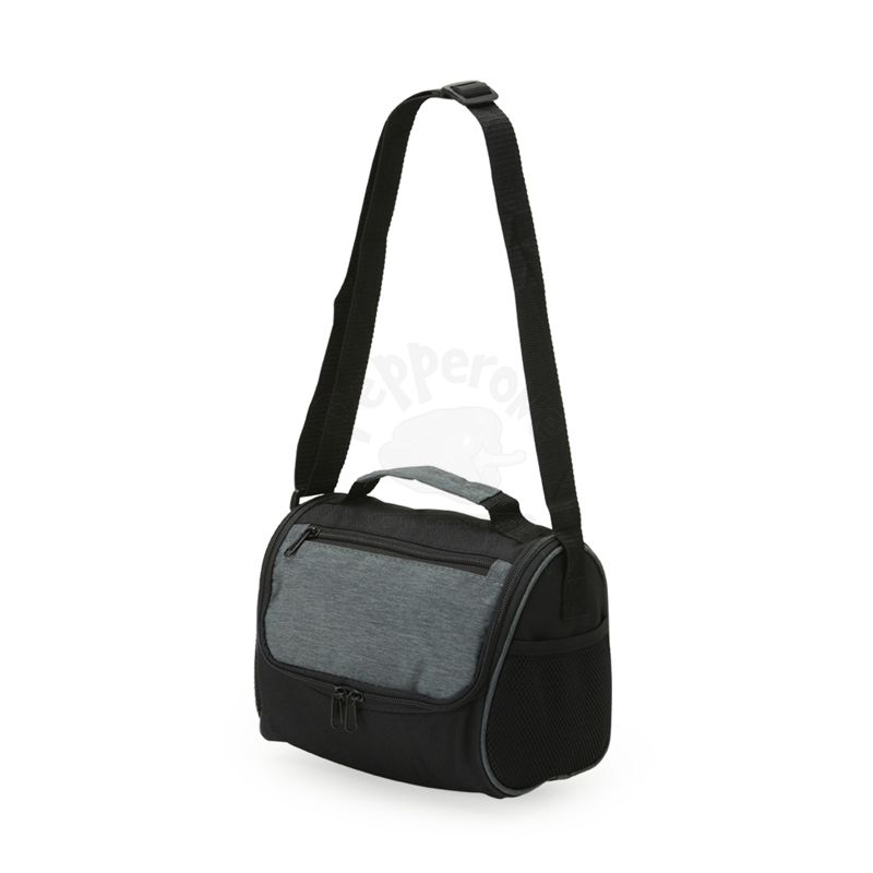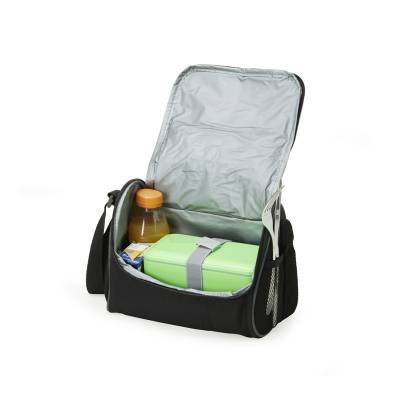 Bolsa térmica de poliéster com dois compartimentos, capacidade de 7 litros. A bolsa possui revestimento térmico em PEVA atóxico, alça de mão, bolsos laterais telados e alça transversal. Ideal para divulgar sua empresa em eventos corporativos, brindes personalizados e campanhas promocionais.