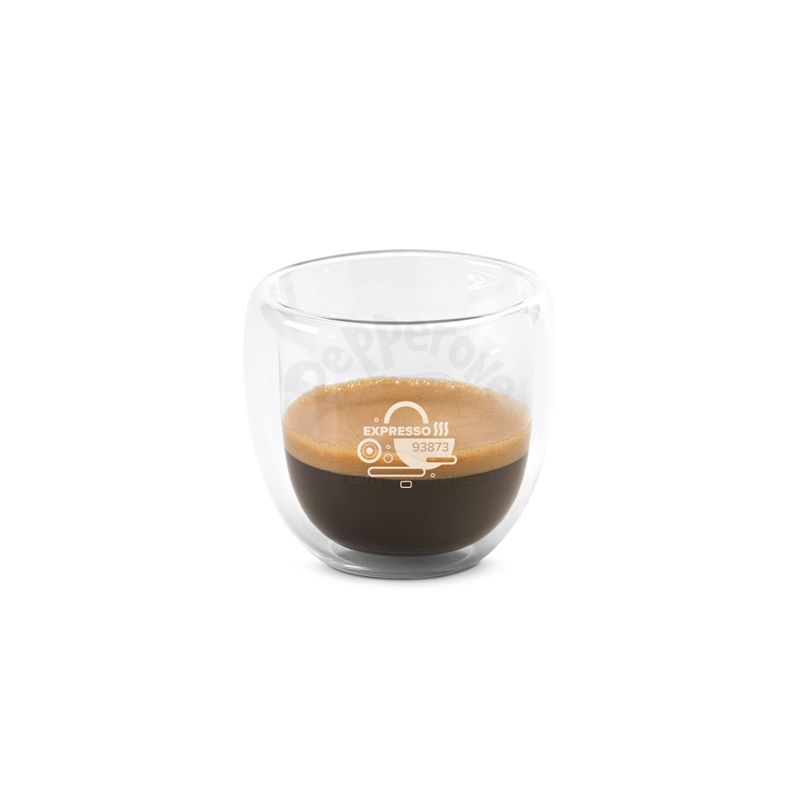 Conjunto de café personalizado, possui dois copos de vidro isotérmico com parede dupla isolada a ar com capacidade de até 75 ml. Conjunto é fornecido em caixa presente personalizável (133 x 65 x 65 mm). Ideal para brindes promocionais e eventos corporativos.