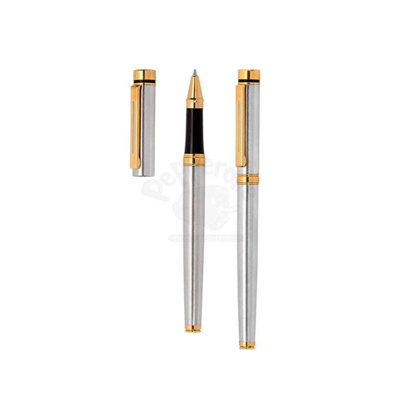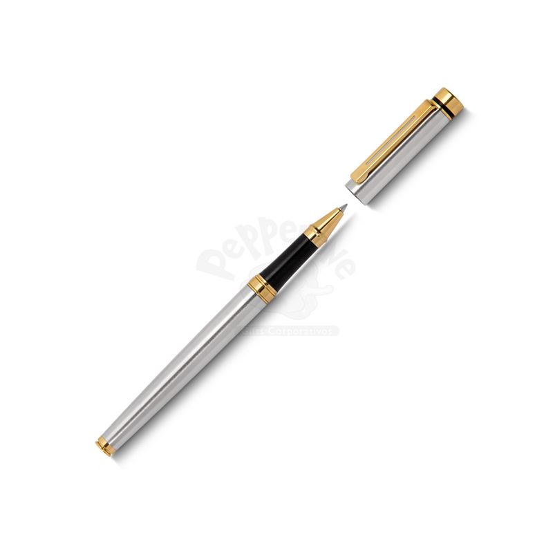 Caneta roller de metal personalizada, possui clip de metal e detalhe diferenciado no corpo da caneta em cor dourada dando um toque elegante e luxuoso ao brinde personalizado. As canetas roller são conhecidas por sua capacidade de criar linhas suaves e precisas, e são geralmente consideradas mais macias e fáceis de usar do que canetas esferográficas comuns. Ideal para brindes promocionais e eventos corporativos.