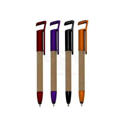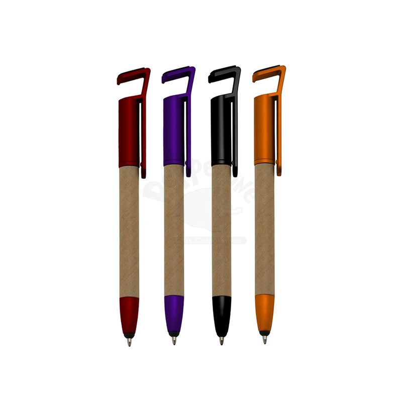Caneta ecológica personalizada produzida 100% em papel reciclável, possui ponteira touch, Clip plástico utilizado como suporte para o celular, parte superior com limpador de tela, acionamento por giro e esferográfica na cor azul. Ideal para brindes promocionais e eventos corporativos.