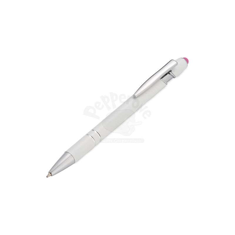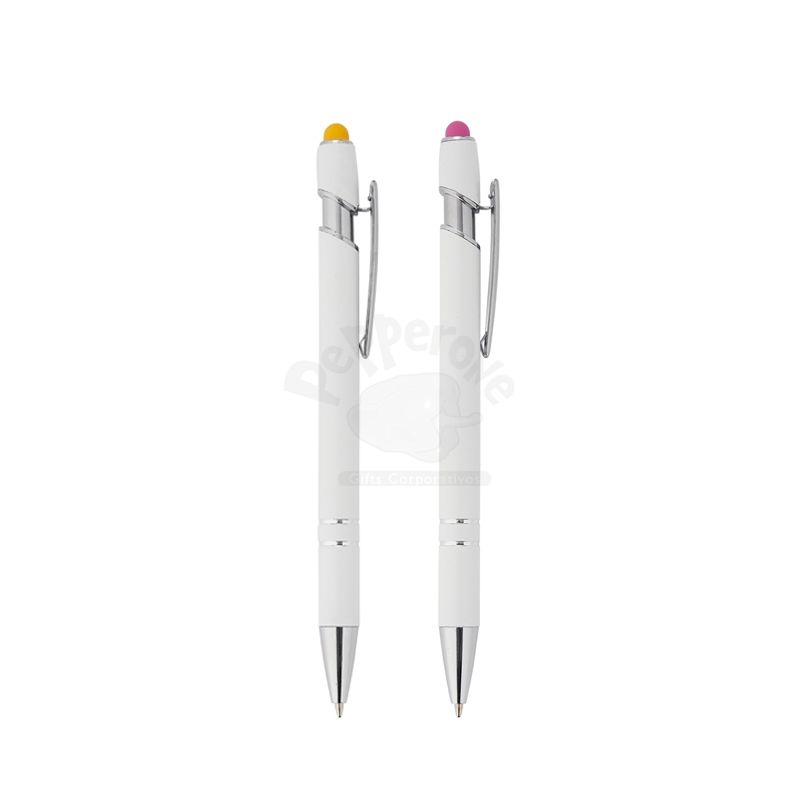 Caneta de metal personalizada predominantemente branca com dois aneis cromados adicionando mais beleza e elegância ao produto. Possui acionamento por click com escrita na cor azul, ponteira touch em cores diversas para uso em tablets e smartphone.