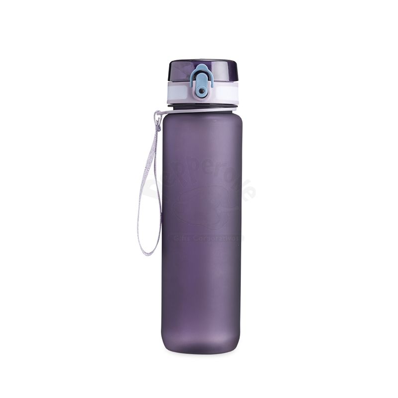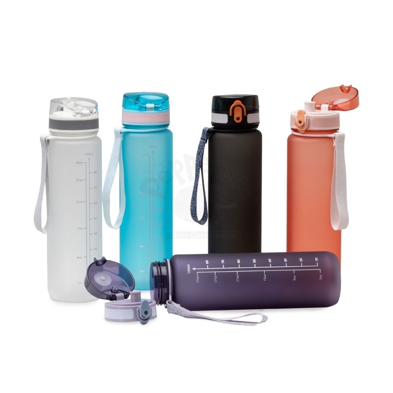 Squeeze plástica de 1 litro com tampa de acionamento automático e trava de segurança. Acompanha cordão de nylon.