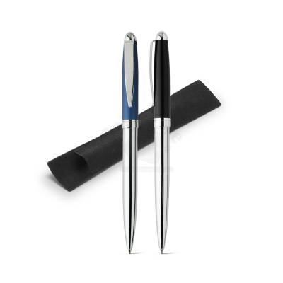 Caneta de metal personalizada com detalhe colorido, possui clip de metal, esferográfica na cor azul, estojo de veludo e acionamento da escrita através do sistema giratório. Ideal para divulgar sua empresa em eventos corporativos, brindes personalizados e campanhas promocionais.