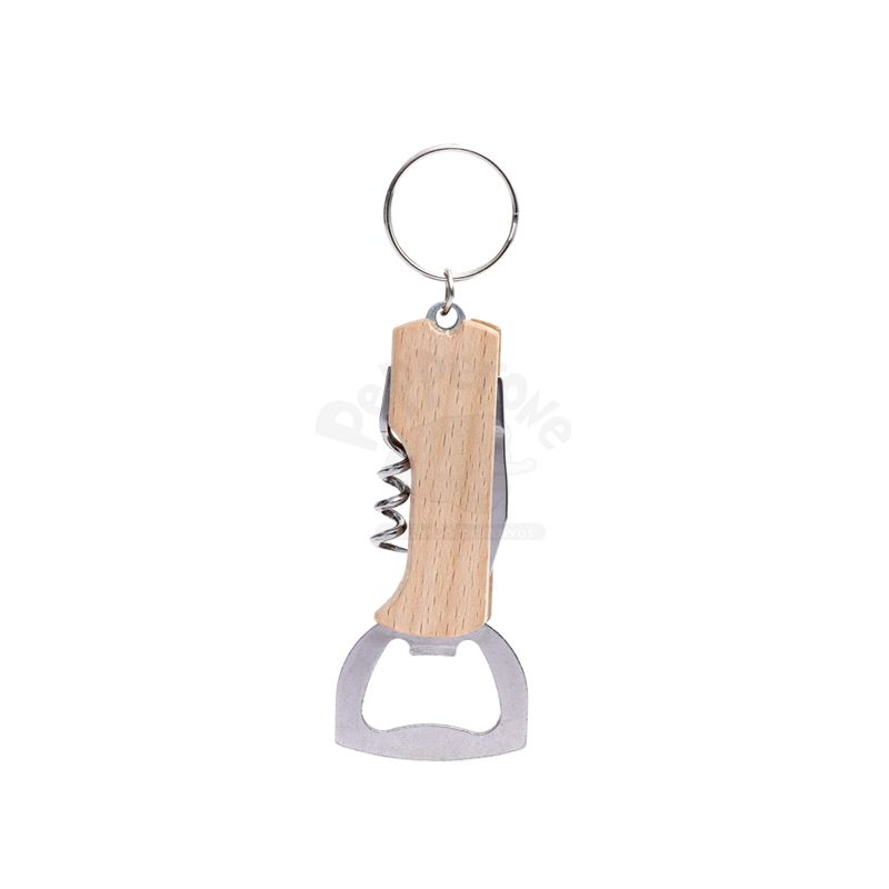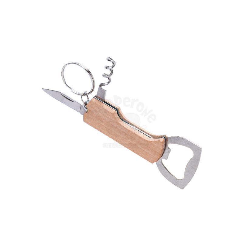 Chaveiro multifunções em madeira com abridor de garrafas, saca rolhas e lâmina de corte. Ideal para divulgar sua empresa em eventos corporativos, brindes personalizados e campanhas promocionais.