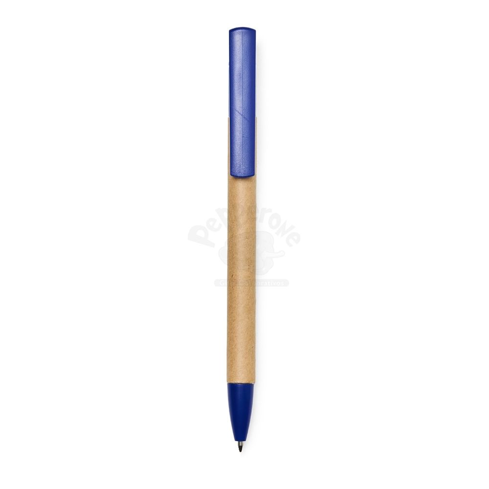 Caneta de papelão com suporte para celular, carga esferográfica azul 0,8 mm e acionamento por clique.