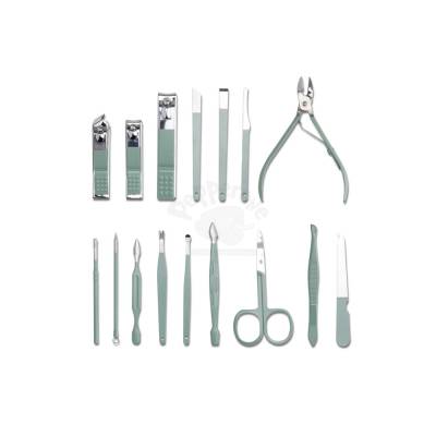 Kit manicure 16 peças em estojo de couro sintético estilo envelope, contém: tesoura, alicate de cutícula, pinça, 3 cortadores de unha, lixa, 2 bisturis, raspador, empurrador de cutícula, removedor de cutícula, espátula dupla para limpeza das unhas, limpador de ouvido, palito de unha e espátula para ouvido.