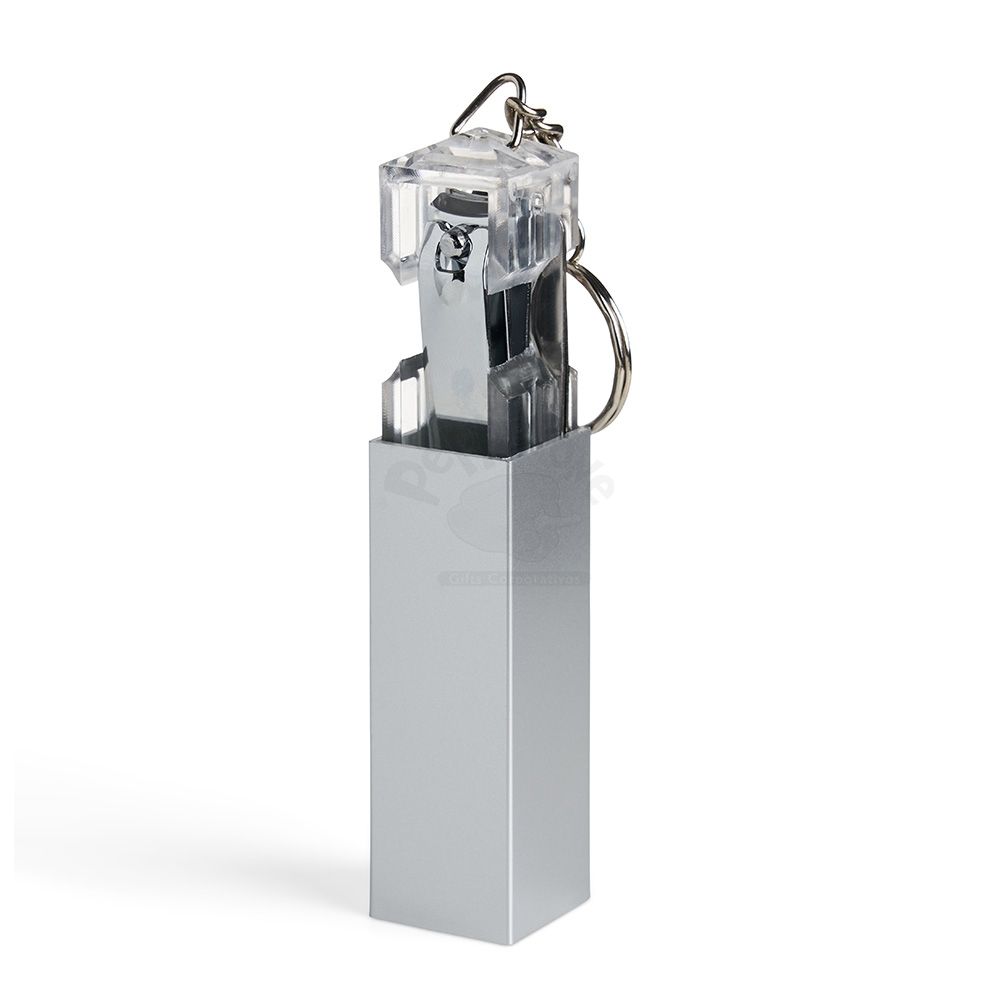 Chaveiro kit manicure 4 peças em estojo plástico. Possui lixa, pinça, empurrador de cutícula e cortador de unha preso. Estojo com berço plástico para acomodação das peças.