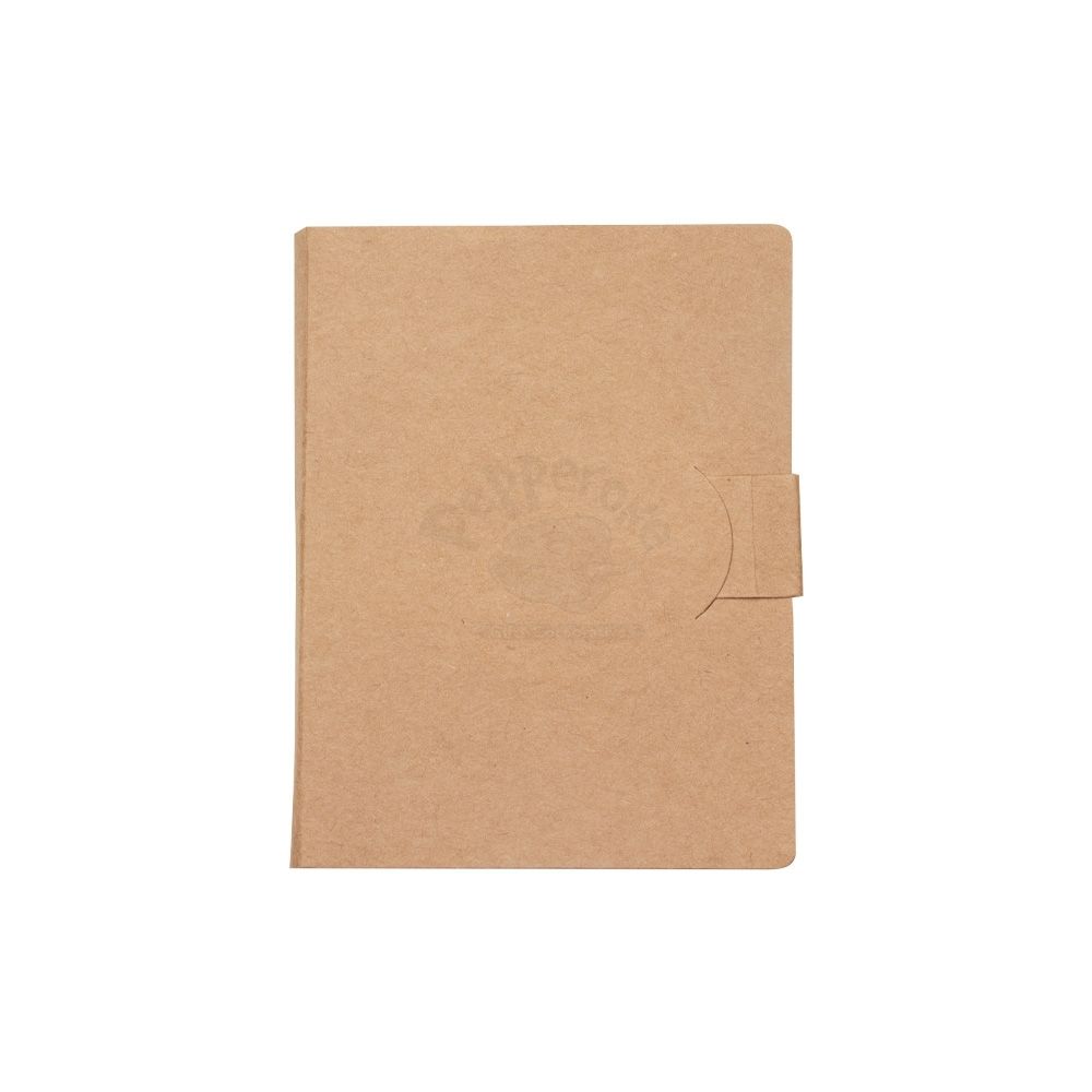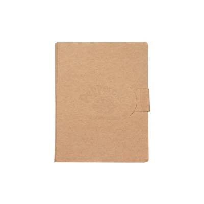 Bloco de anotações ecológico com autoadesivos, feito em kraft. Contém cinco autoadesivos com aproximadamente 25 folhas e dois blocos com aproximadamente 25 folhas amarelas.