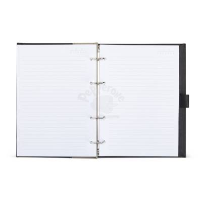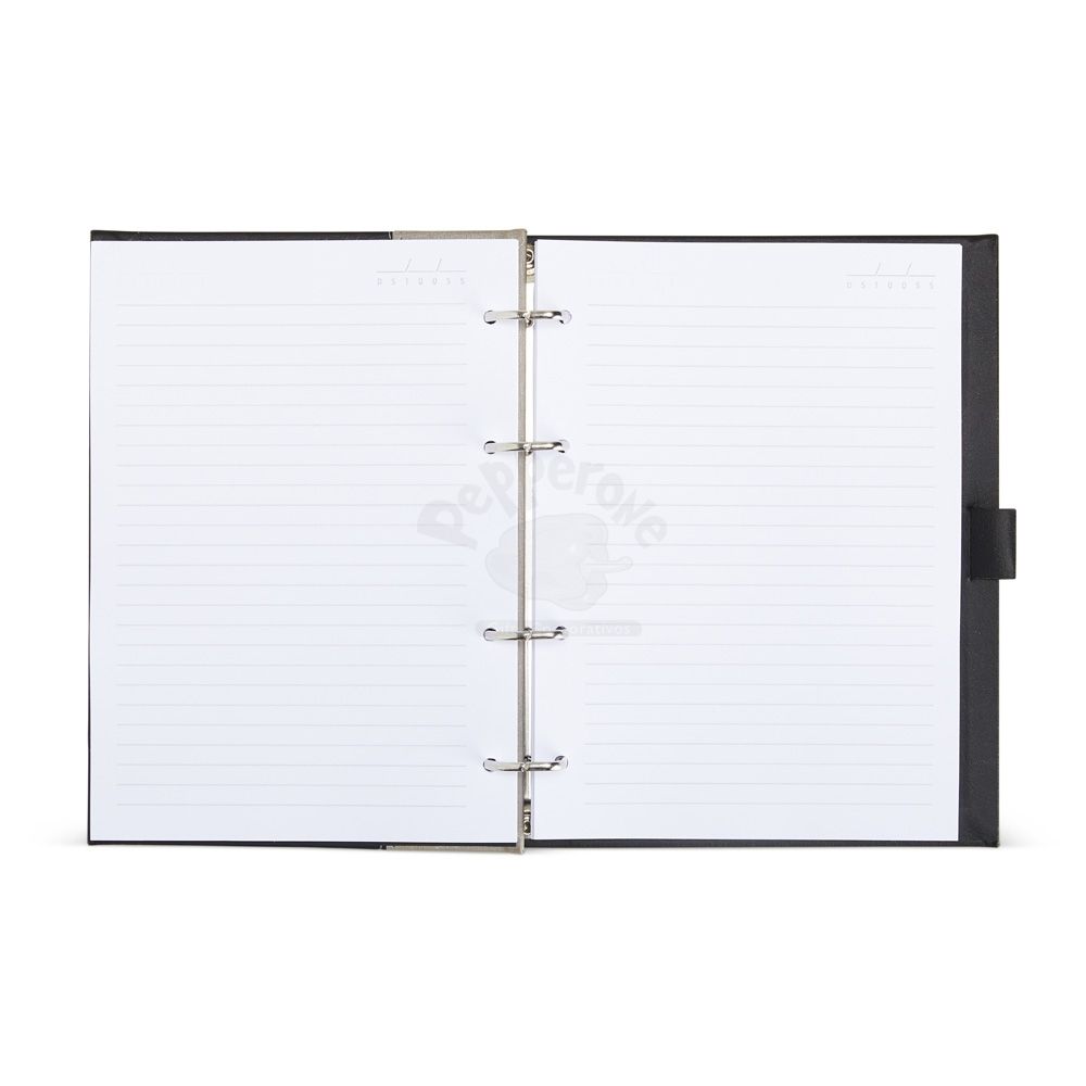 Caderno fichário em couro sintético. Possui suporte na lateral para caneta ( não acompanha) e aproximadamente 100 folhas.