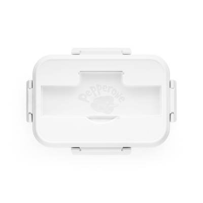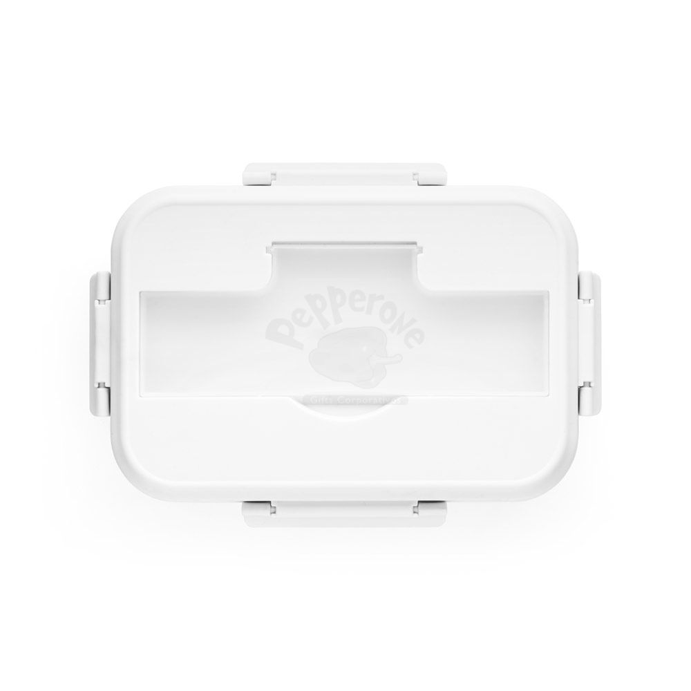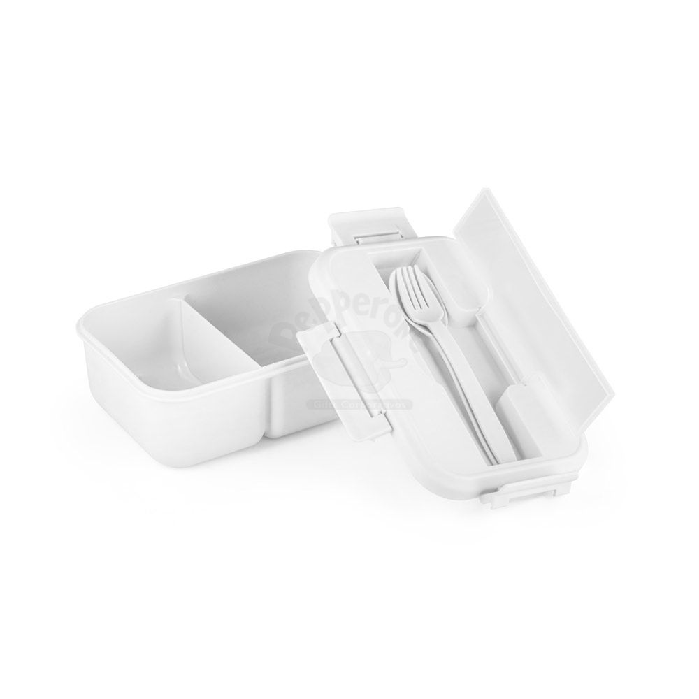 Marmita em PP com capacidade até 1 L. A tampa tem um compartimento para talheres (inclusos). A caixa é apta para micro-ondas, sendo necessário retirar a tampa. Não aconselhável para líquidos.