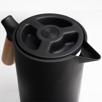 Garrafa térmica com capacidade de 1 litro, fabricada em plástico com ampola de vidro na parte interna. Contém tampa rosqueável com botão no centro para abrir e fechar o líquido, cabo de madeira com detalhe na parte superior com aderência para o dedo polegar. A garrafa possui ondulações em relevo e um design minimalista.