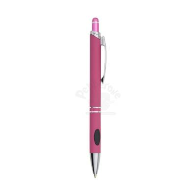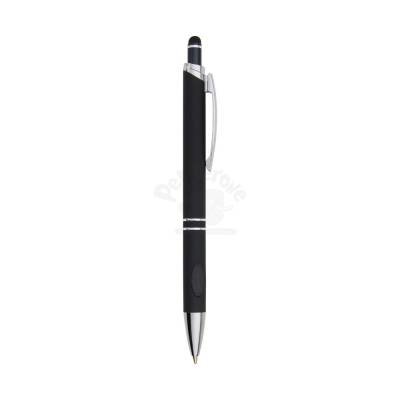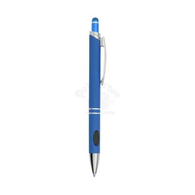 Caneta metálica touchscreen com acabamento emborrachado, acionamento por clique e carga esferográfica azul 1.0mm.