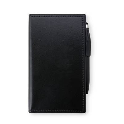 Kit para anotações em couro sintético com autoadesivos e caneta plástica. Contém 3 blocos com aproximadamente 50 folhas, conjunto de 5 marcadores plásticos autoadesivos com aproximadamente 25 folhas e caneta plástica touchscreen com carga esferográfica azul 1.0mm e acionamento por rotação.