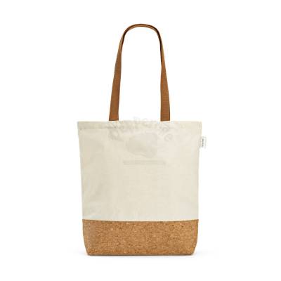 Sacola em 70% algodão reciclado e 30% poliéster reciclado (180 g/m²) com fundo em cortiça. Alças em webbing com 65 cm.