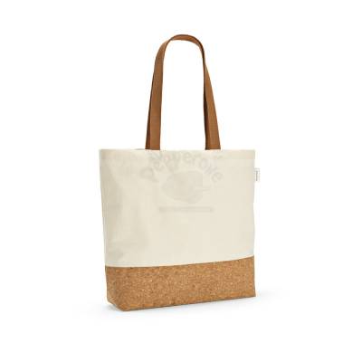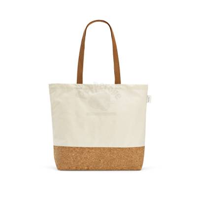 Sacola em 70% algodão reciclado e 30% poliéster reciclado (220 g/m²) com fundo em cortiça. Alças em webbing com 65 cm.