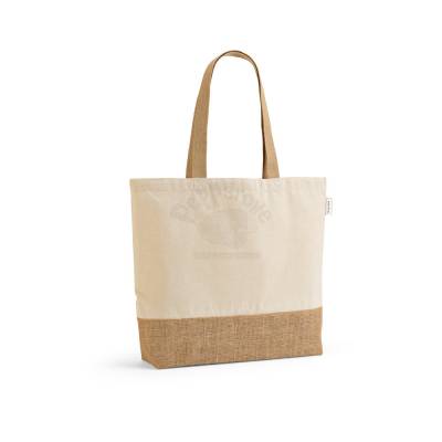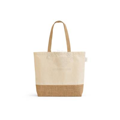 Sacola em 70% algodão reciclado e 30% poliéster reciclado (220 g/m²) com base em juta. Alças em webbing com 65 cm.