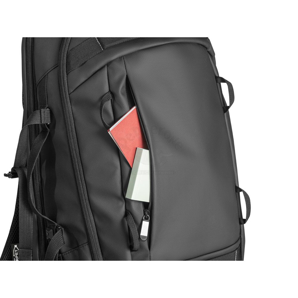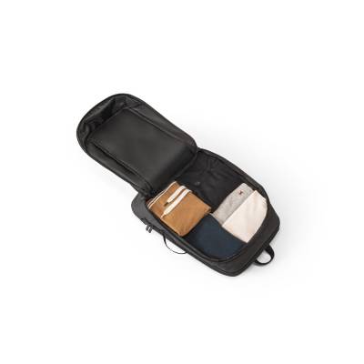 Mochila para notebook em 900D, poliéster reciclado (100% rPET), de alta densidade, com revestimento resistente à água e forro em 210D poliéster reciclado (100% rPET). Possui 1 compartimento traseiro com divisória almofadada para notebook até 17.3" e um bolso frontal com zíper. Parte posterior com acolchoamento extra. Contém cintas de compressão removíveis na parte frontal da mochila e detalhes refletores nas pegas e alças. Capacidade até 21 L