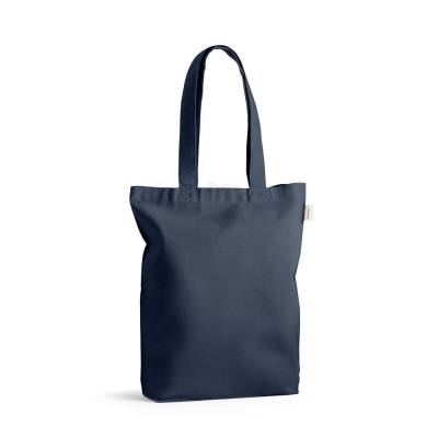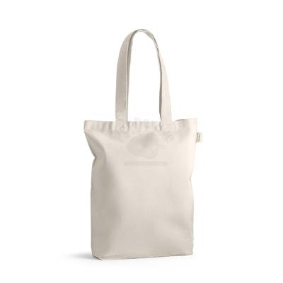 Sacola em 70% algodão reciclado e 30% poliéster reciclado (220g/m²), com alças de 65 cm. O tecido é sem tingimento, é utilizado na sua cor original, sem produtos químicos de tingimento ou branqueamento, contribuindo para um menor impacto ambiental.