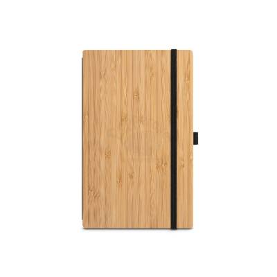 Caderno A5 de capa e contracapa em placa de bambu e lombada em poliéster 100% reciclado (100% rPET). O interior contém 96 folhas pautadas com papel reciclado, suporte para esferográfica (não inclusa) e elástico para fecho do caderno. A cor e o resultado da impressão nos materiais naturais pode variar entre produtos.