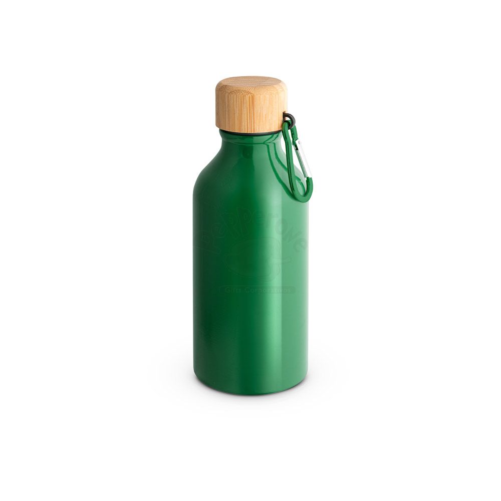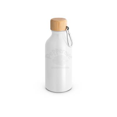 Squeeze em alumínio 100% reciclado com cor sólida brilhante. A squeeze tem uma tampa em bambu, à prova de água, e mosquetão que facilita o transporte. Capacidade até 400 mL. Caixa branca 94656 vendida opcionalmente. Certificação EU Food Grade. A cor e o resultado da impressão nos materiais naturais pode variar entre produtos.