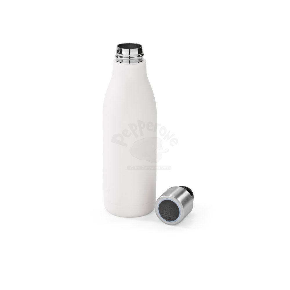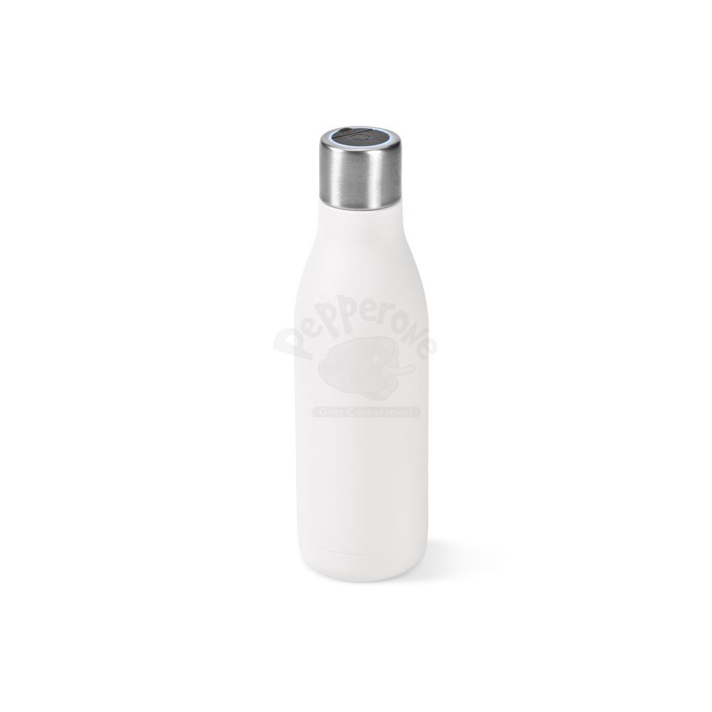 Garrafa em aço inox (90% reciclado) de parede dupla térmica, isolada a vácuo. Garrafa com sistema de auto-sanitização UV que inativa vírus e bactérias que estejam na sua garrafa, tornando a sua bebida mais segura. Capacidade até 500 mL. Preserva as bebidas quentes por 5h e frias por 15h, aproximadamente. Caixa branca 94657 vendida opcionalmente. Certificação EU Food Grade.