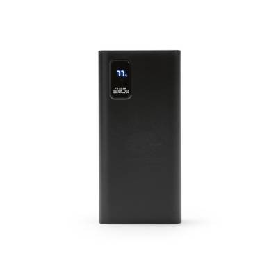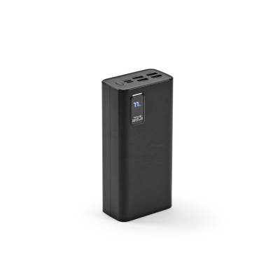 Bateria portátil em ABS 100% reciclado. Bateria em lítio com capacidade de 30.000 mAh e tempo de vida ≥ 300 ciclos. Possui entrada micro-USB e USB-C, 4 saídas USB-A e uma saída USB-C. A parte frontal tem uma tela de LED com informações do nível de carga da bateria. Incluso cabo USB-C para carregamento da bateria. Fornecida em caixa presente de papel kraft.