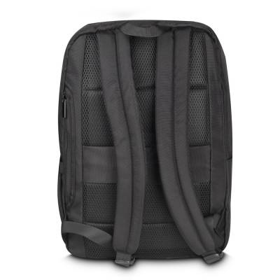 Mochila para notebook em tecido poliéster e detalhe em PU, compartimento interno para notebook de até 15,6", engate para mala de viagem, dois bolsos laterais e bolso frontal com zíper.