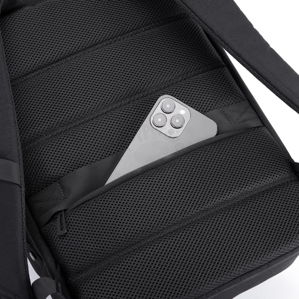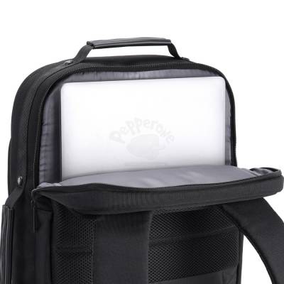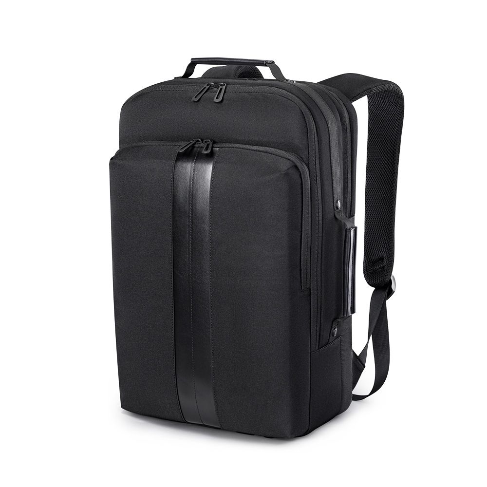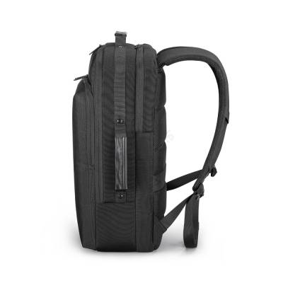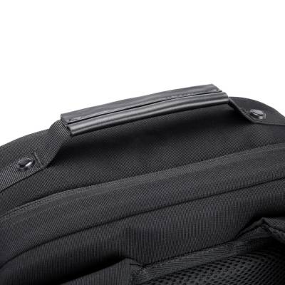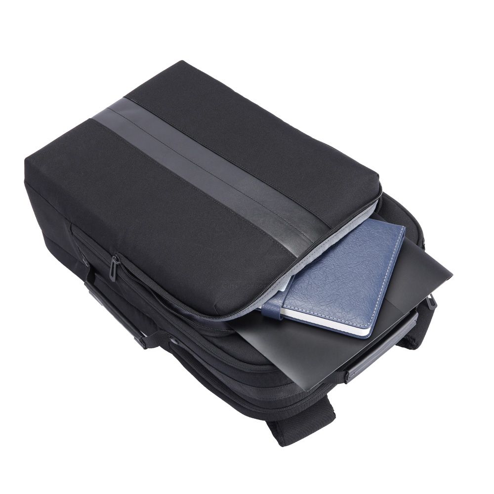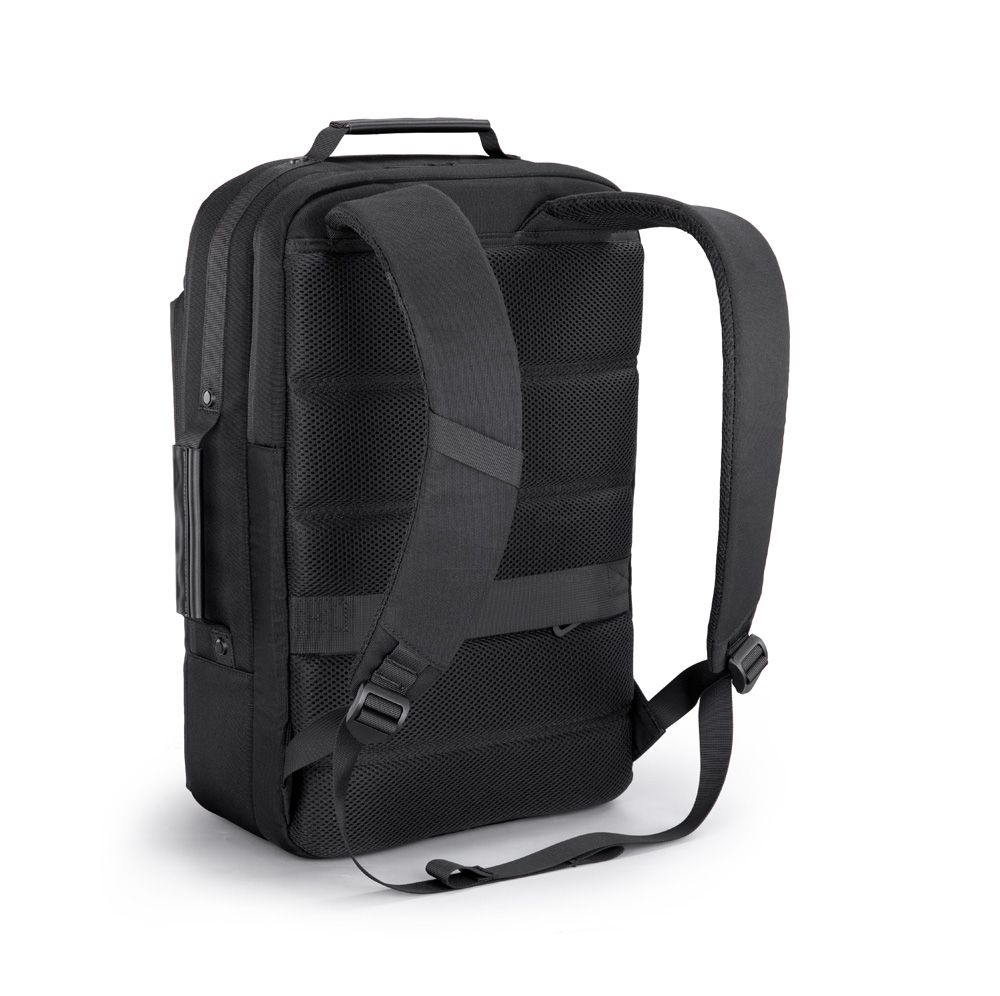 Mochila/Pasta premium, produzida em poliéster com detalhe em PU, alças de ombro acolchoadas, interior com divisórias com zíper para acomodar pequenos objetos, dois bolsos frontais com zíper, na parte das costas uma divisória com zíper, engate para mala de viagem, aceita notebook de até 15,6”, porta USB tipo C na lateral.