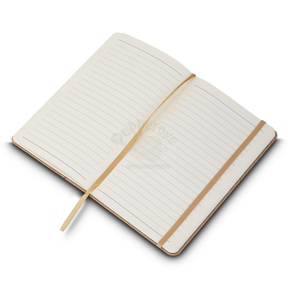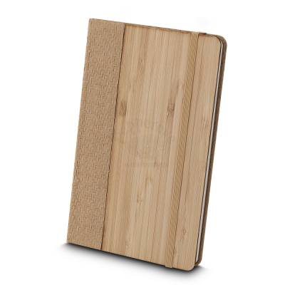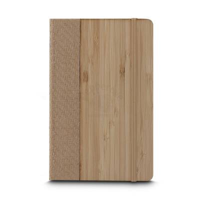 Caderno de anotações, capa em fibra de bambu com elástico e miolo com 80 folhas pautadas na cor bege.
