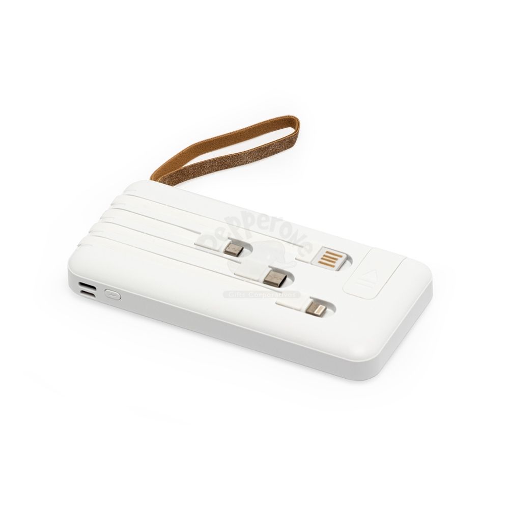 Carregador power bank de 10.000mAh com lanternas, múltiplas saídas e suporte para celular. Fabricado em plástico com display integrado, este power bank vem equipado com quatro cabos de carregamento, eliminando a necessidade de transportar cabos extras. Compatível com entradas V8, Tipo-C, Lightning e USB, praticidade é o sinônimo deste carregador. Com alça de couro sintético e um suporte funcional para celular, estilo gaveta, o power bank possui capacidade real de 6.000mAh para manter os dispositivos sempre carregados. Acompanha cabo USB-V8.