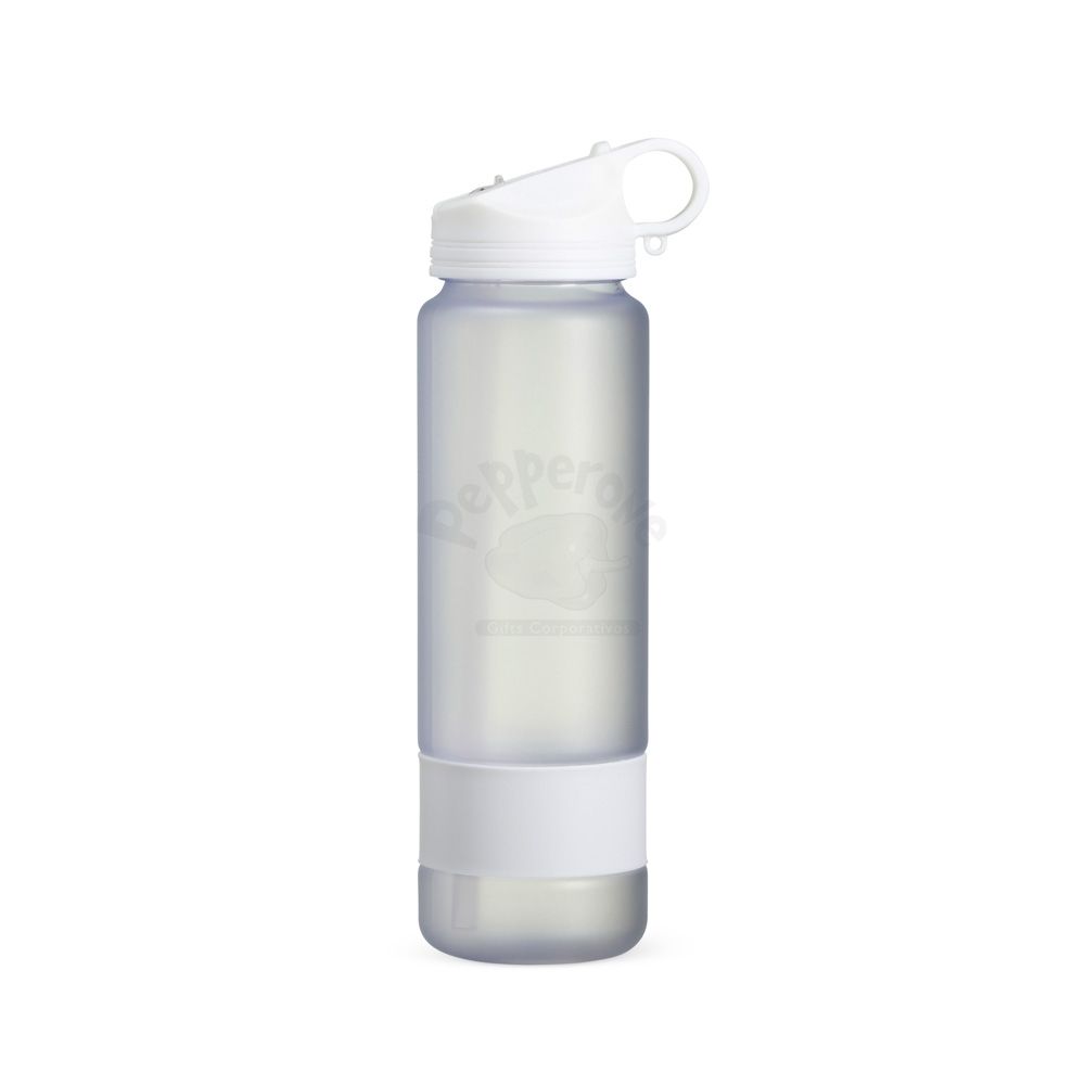 Squeeze plástico com capacidade de 900ml com acabamento fosco e detalhe emborrachado na parte inferior. Possui tampa rosqueável com alça integrada e bico flip com tampa protetora. Acompanha canudo.