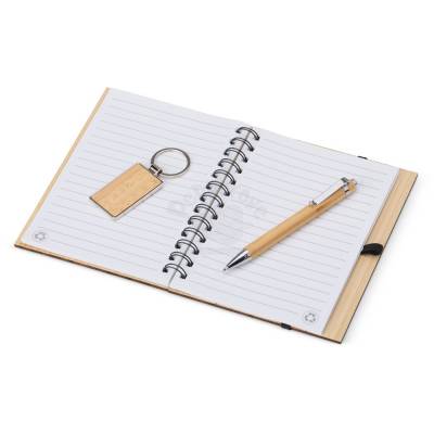 Kit executivo ecológico 3 peças em estojo de papelão. Contém: chaveiro de bambu com detalhe em metal, caderneta em bambu, capa dura, com aproximadamente 65 folhas brancas pautadas, caneta de bambu com clipe metálico, elástico para lacre e suporte para caneta em nylon.