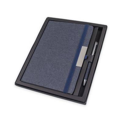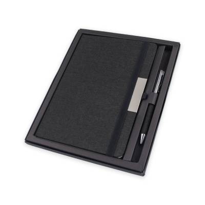 Neste kit o caderno de anotações é feito de PET Reciclado, em capa dura com miolo 80 folhas pautadas, acompanha berço presentável e caneta metálica.