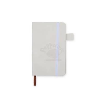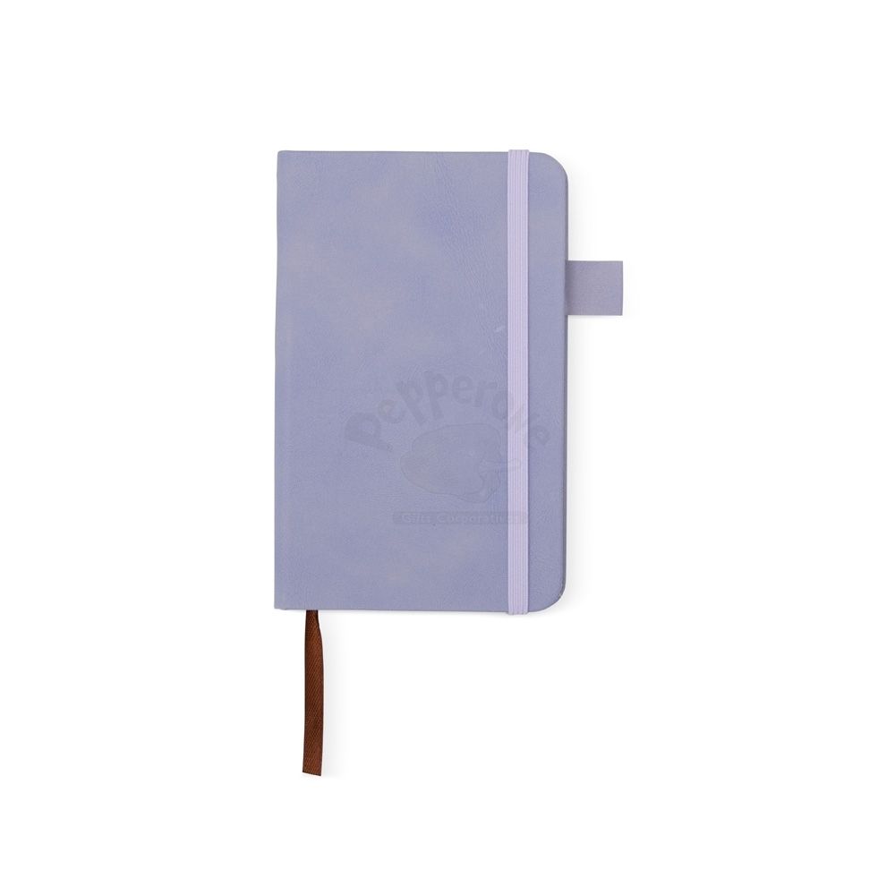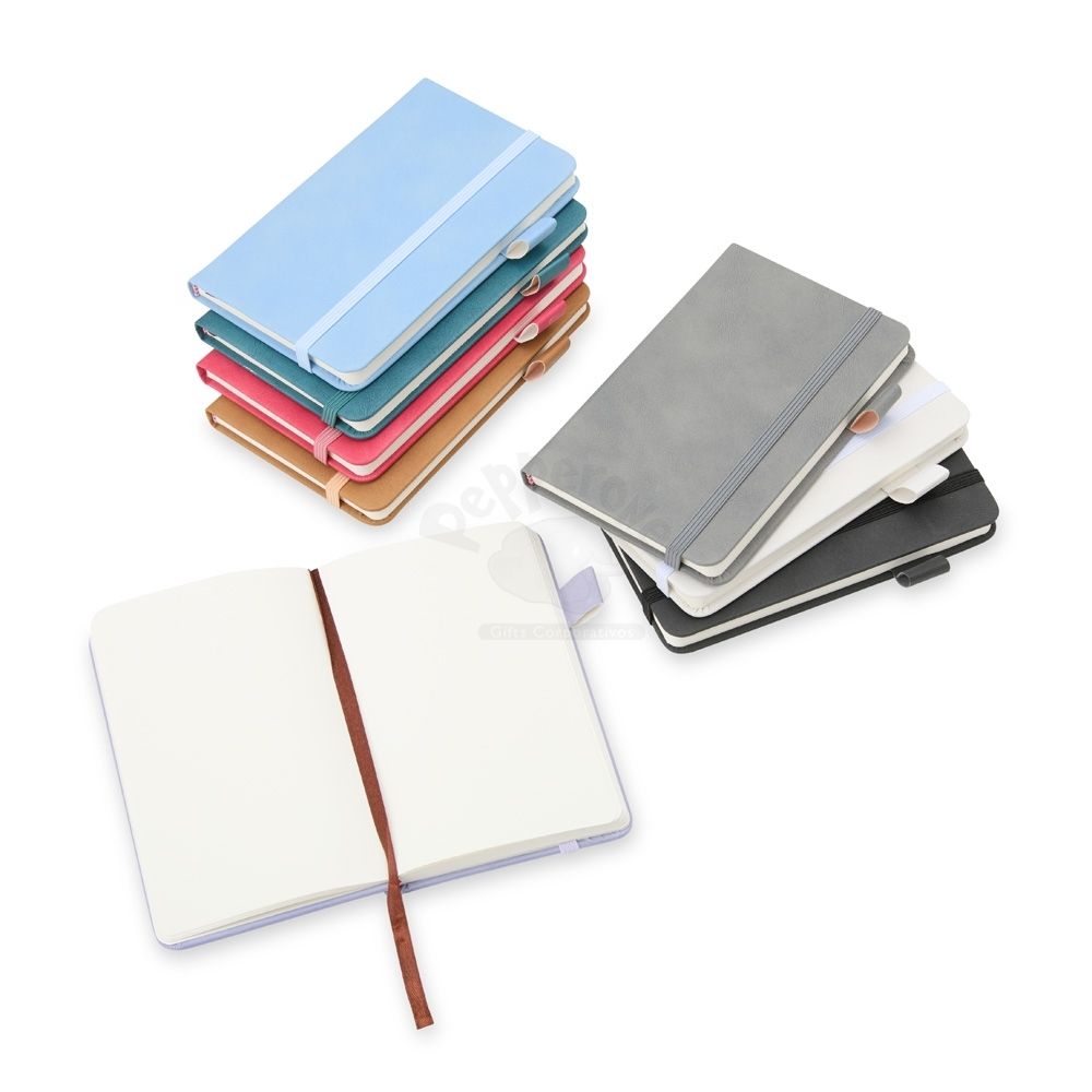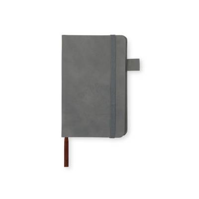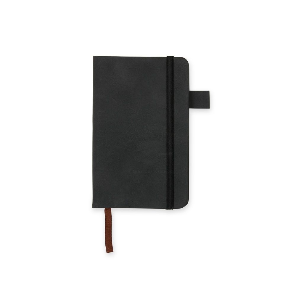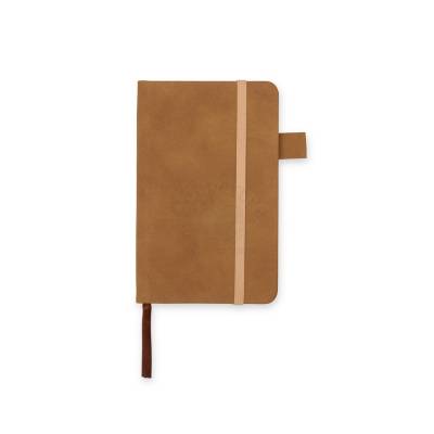 Caderneta em PU com marcador de página em cetim e fita elástica para fechar. Contém aproximadamente 80 folhas amareladas sem pauta.