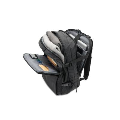 Mochila de viagem em poliéster reciclado (rPET) 600D de alta densidade, com acabamento repelente à água. Composta por 3 compartimentos principais com forro em poliéster reciclado (rPET) 210D: compartimento traseiro com bolso para notebook até 17.3" e bolso para tablet até 10.1", compartimento central expansível com zíper destinado à arrumação de roupa e um compartimento frontal com vários bolsos interiores. Capacidade até 29 L