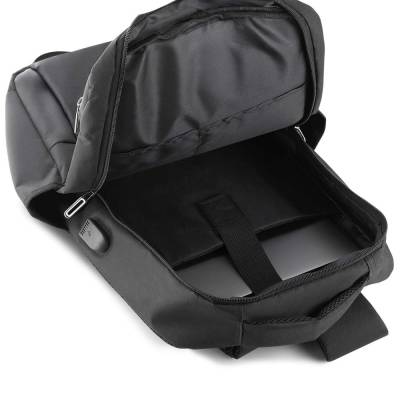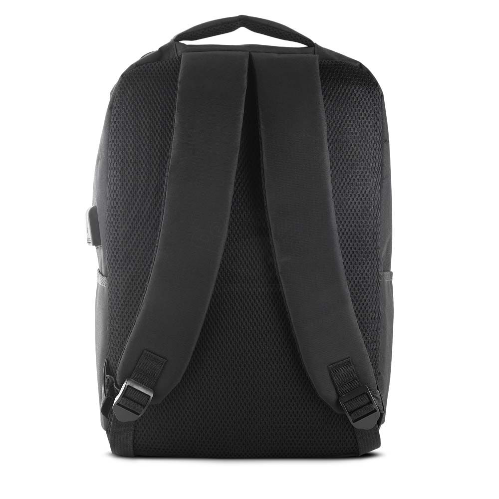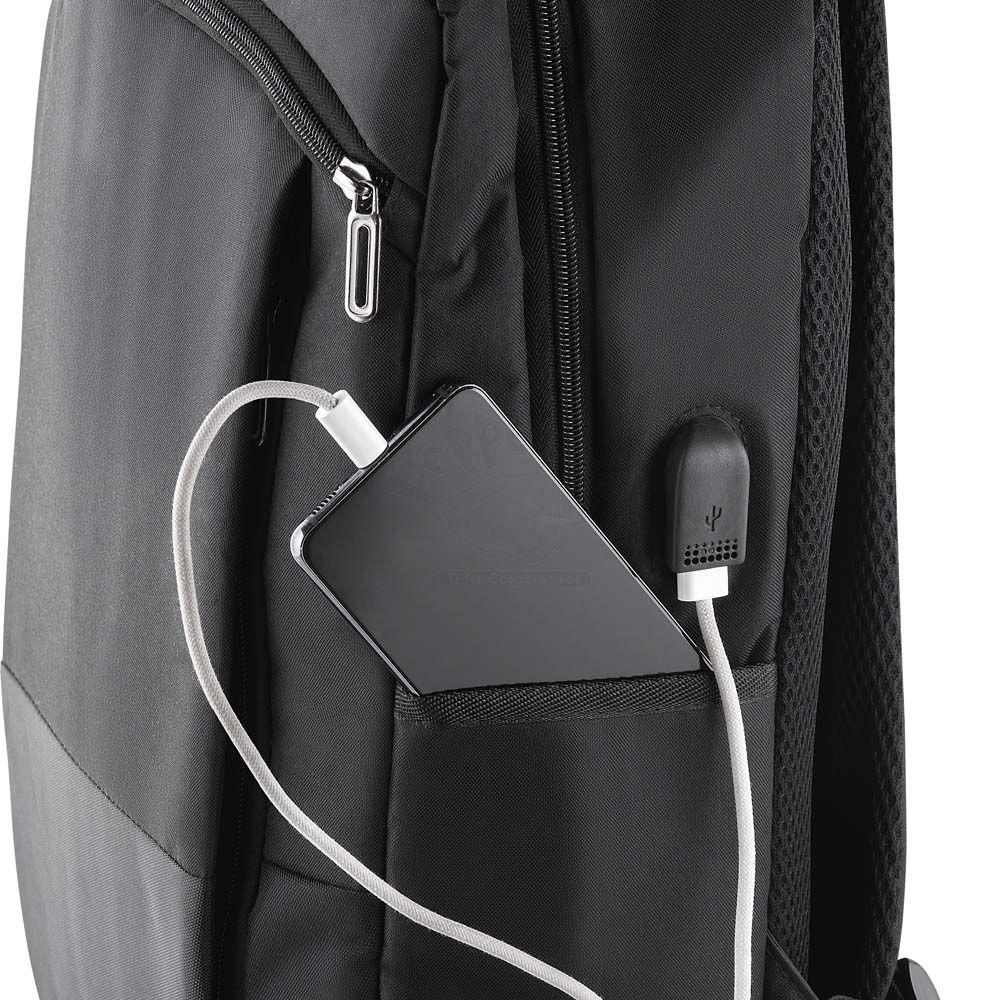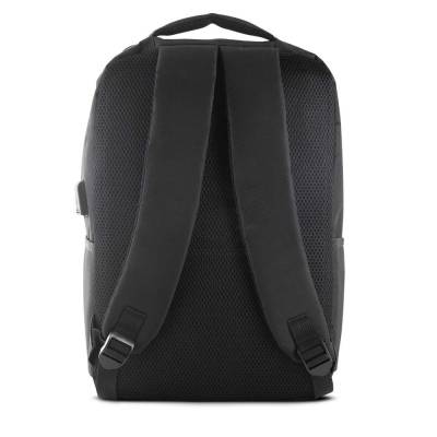 Mochila para notebook em tecido poliéster, sua parte externa contém bolso frontal com zíper, bolso pequeno na lateral direita, conector USB., alça de mão e ombro acolchoada e a parte interna com compartimento acolchoado para notebook até 15.6", porta caneta e porta objeto.