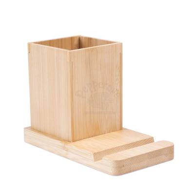Conjunto de mesa em bambu, ideal para organizar o seu espaço de trabalho. Composto por 1 canaleta para suporte do seu celular e um copo, desmontável, para organizar as suas esferográficas e outros materiais de trabalho. Fornecido em caixa presente de papel kraft reciclado.