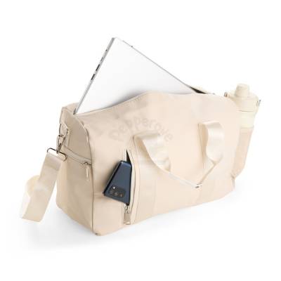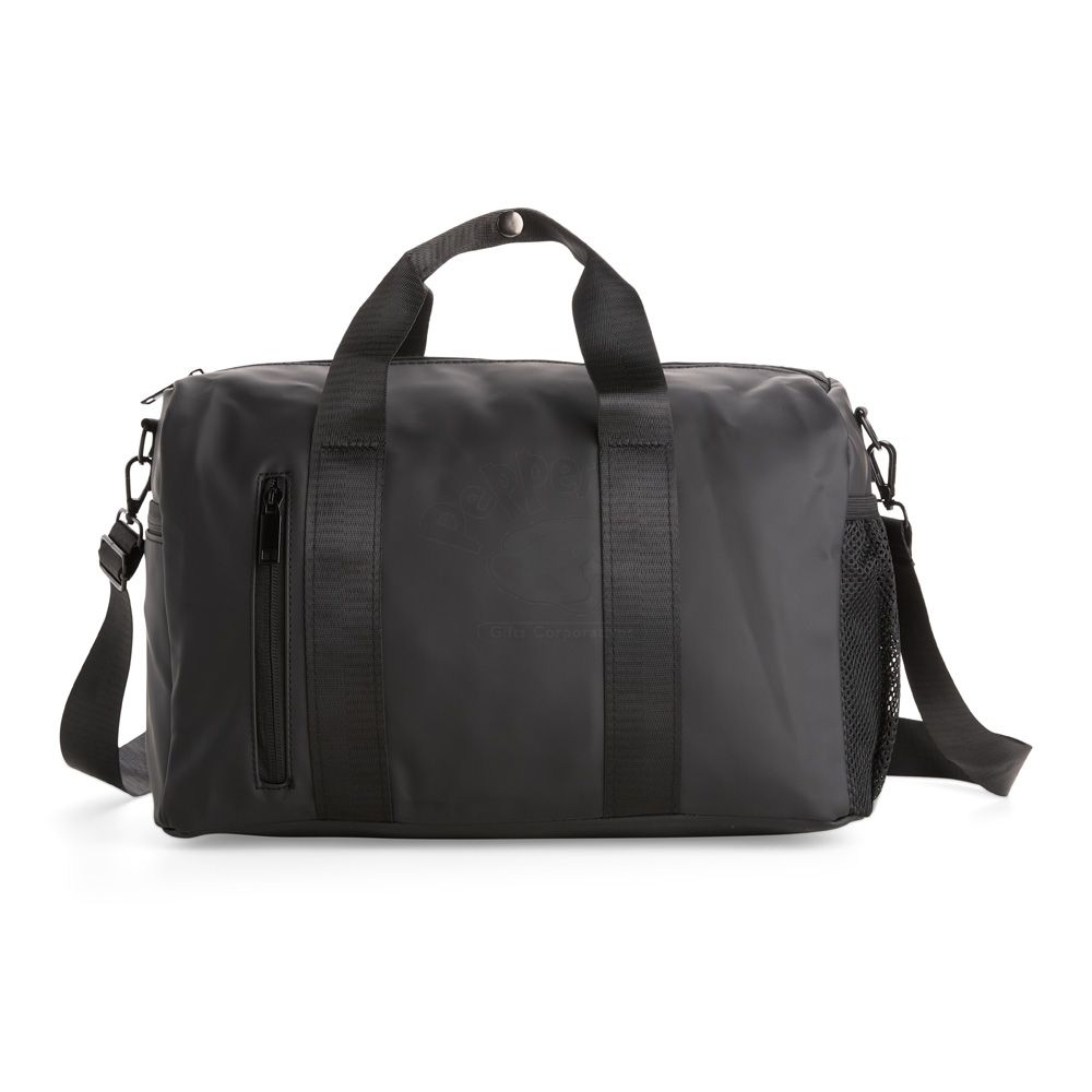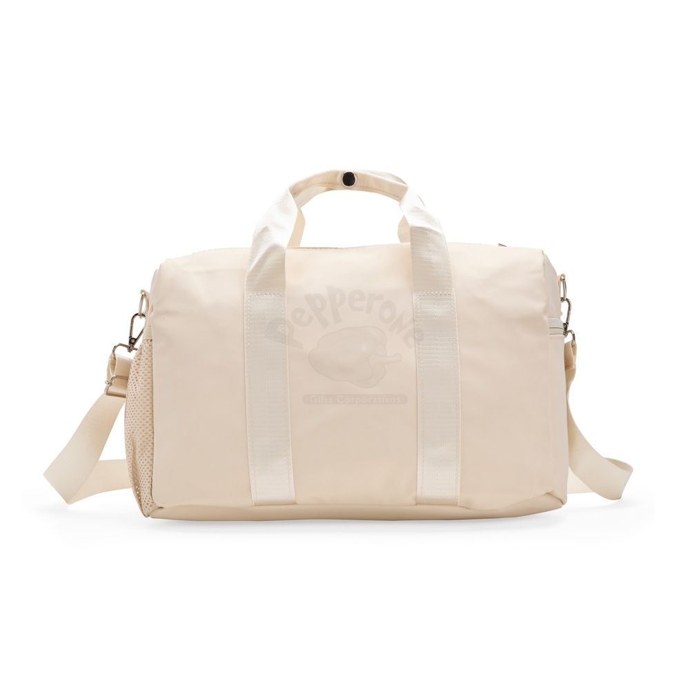 Bolsa confeccionada em couro sintético impermeável com fechamento em zíper e capacidade máxima de 20 litros. Apresenta compartimento interno revestido em nylon e bolso dedicado a objetos menores. Possui dois compartimentos externos em tamanhos diferentes, bolso em tela de nylon e três alças: duas de mão e uma transversal removível.