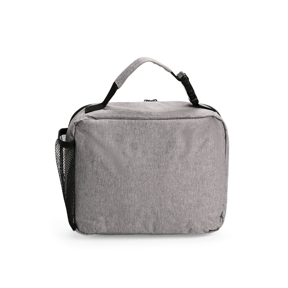 Bolsa térmica em poliéster impermeável com fechamento em zíper e capacidade de até 6 litros. Possui revestimento térmico interno em PEVA atóxico e compartimento em tela de nylon. Apresenta bolso frontal com zíper e bolso telado com elástico, além de alça de mão com engate rápido.