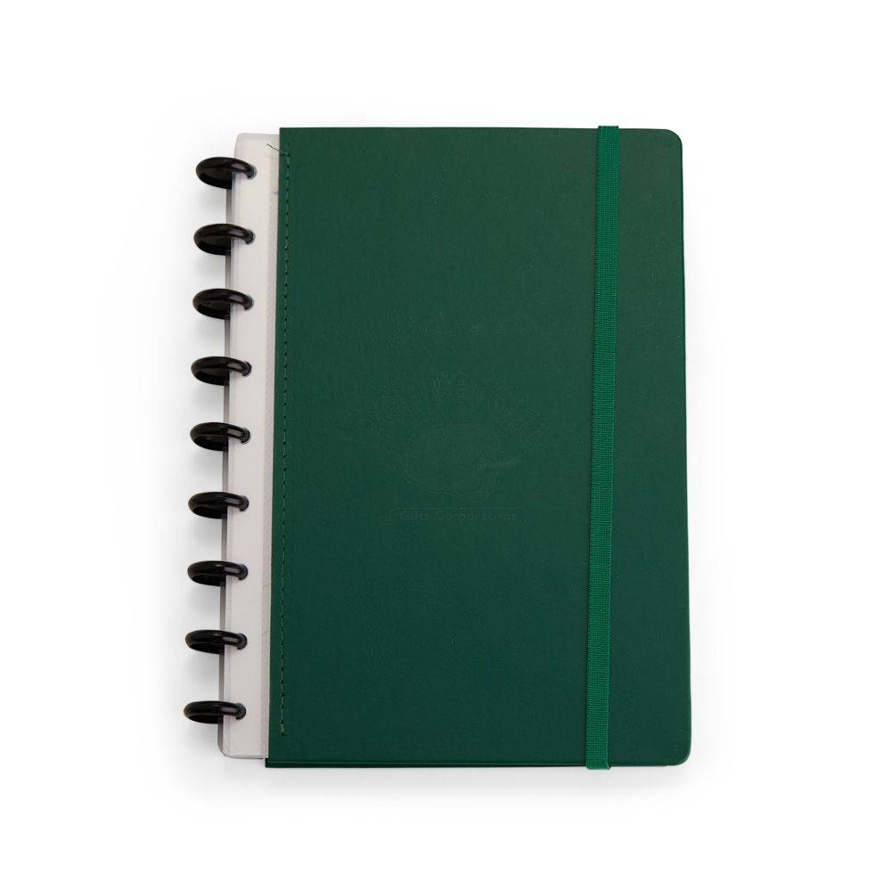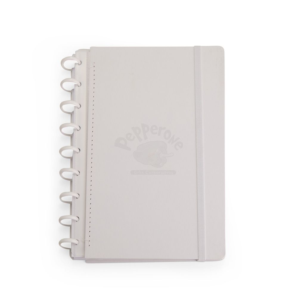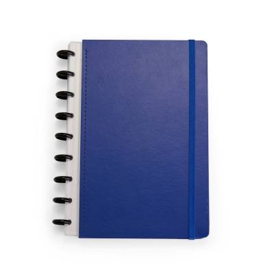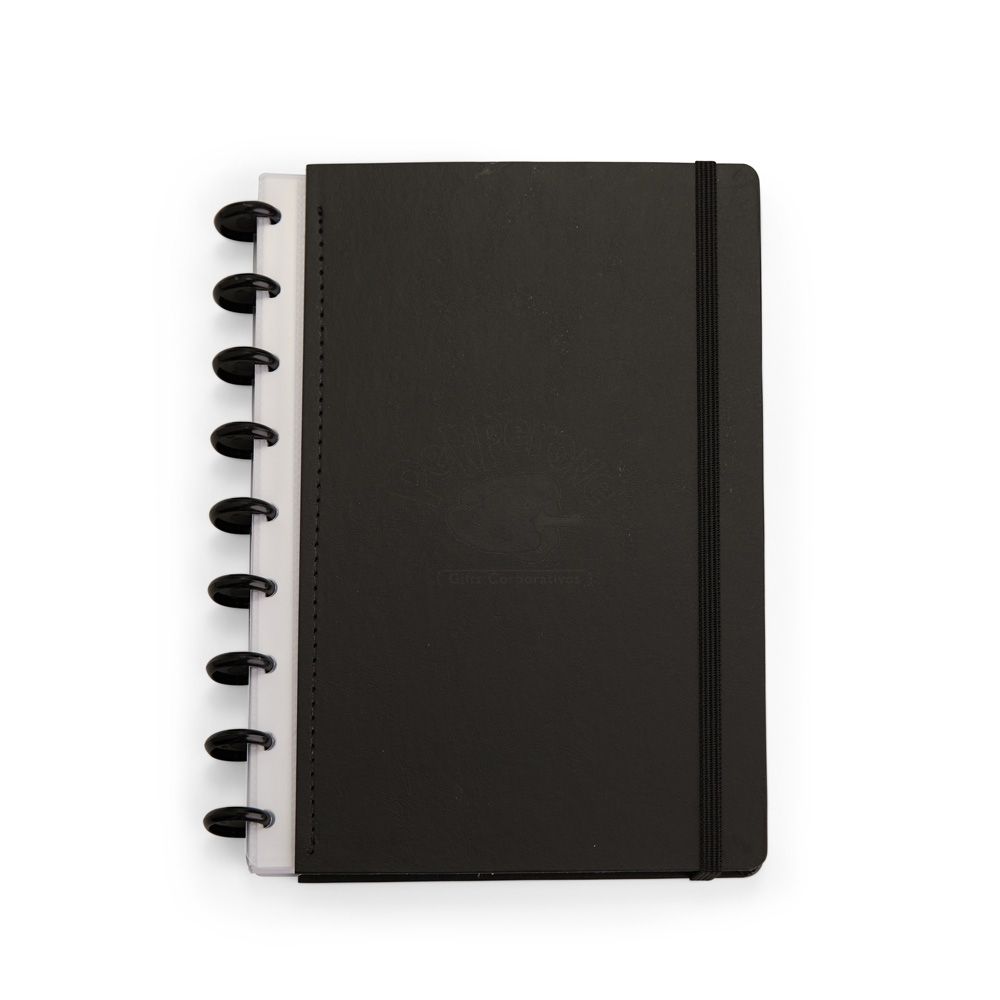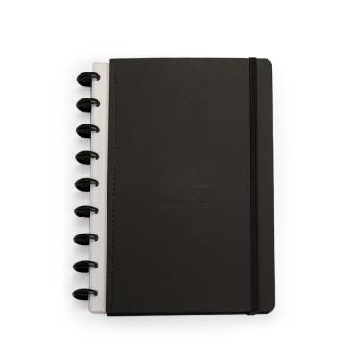 Caderno de capa dura, fechamento em elástico e encadernação com discos plásticos reposicionáveis, que permitem retirar e adicionar folhas compatíveis. Apresenta página para dados pessoais, calendários de 2025 e 2026, folha com instruções de uso e bolso plástico. Possui cerca de 80 folhas brancas pautadas.