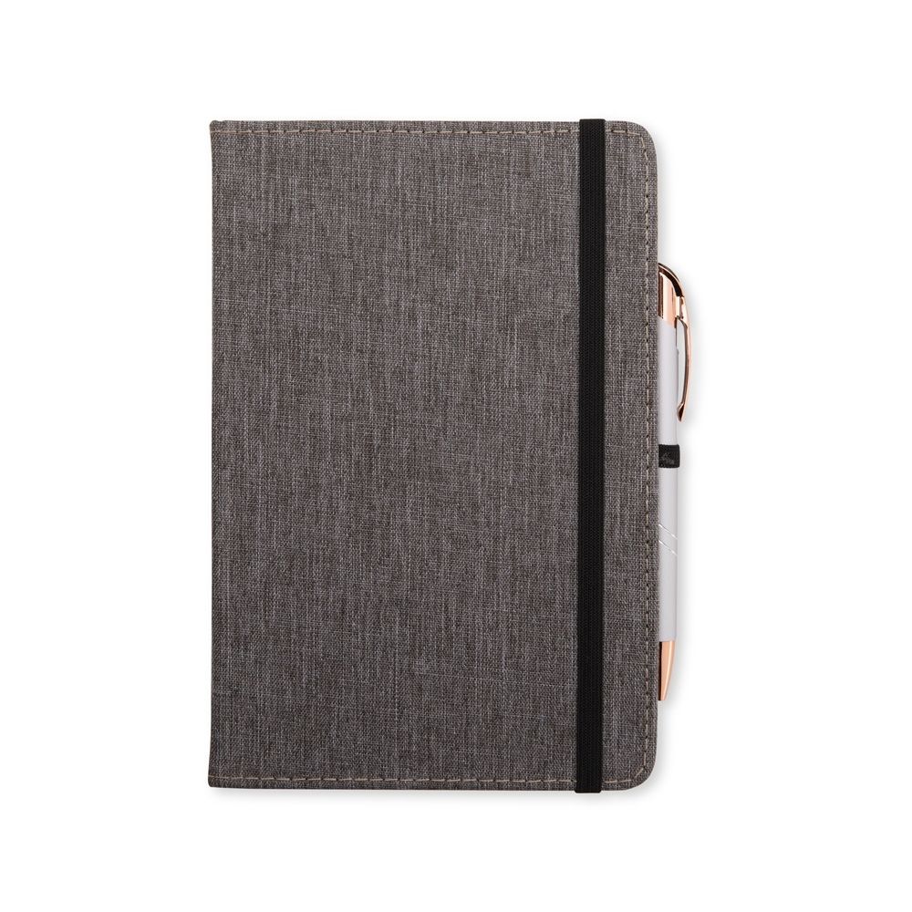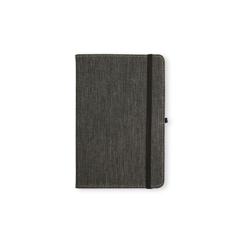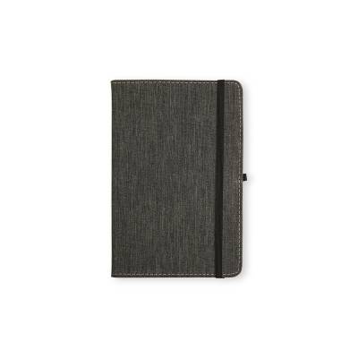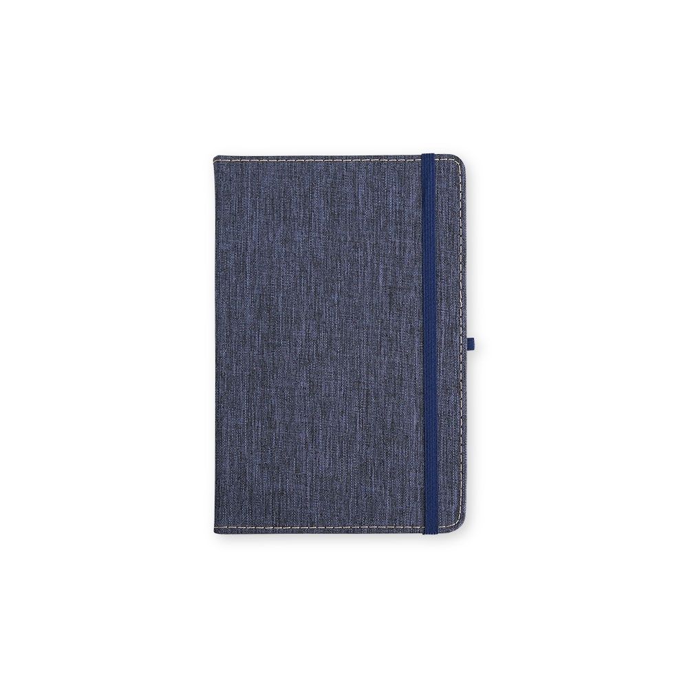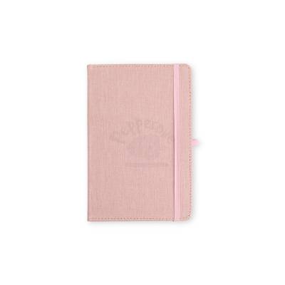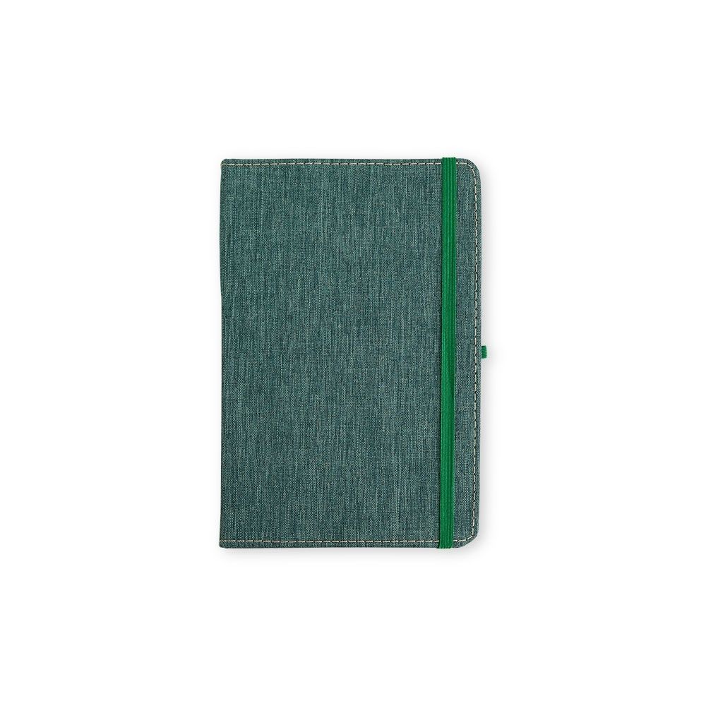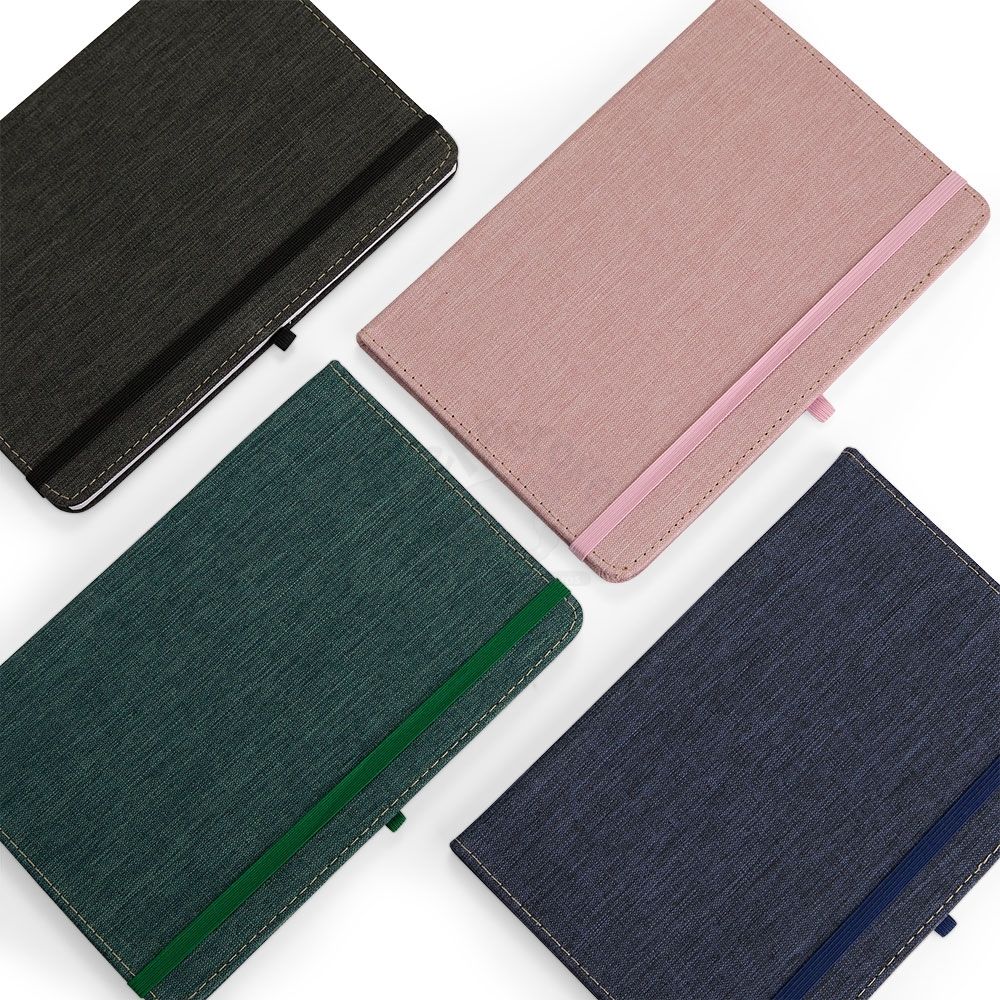 Caderneta com capa dura em linho, fechamento em elástico, marca-páginas em fita de cetim e porta-caneta elástico. Possui cerca de 80 folhas brancas pautadas.