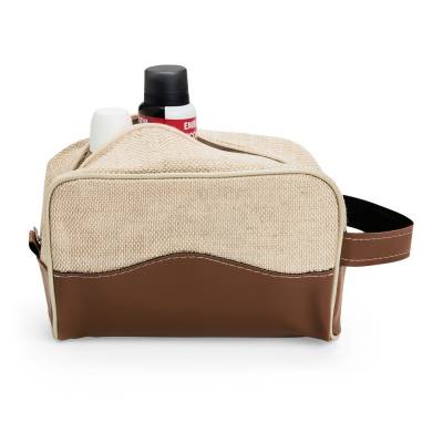 Nécessaire confeccionado em juta com abertura em zíper, detalhes, alça de mão lateral, uma pequena alça adicional para acesso de chaveiro ou gancho e demais detalhes em bidim.