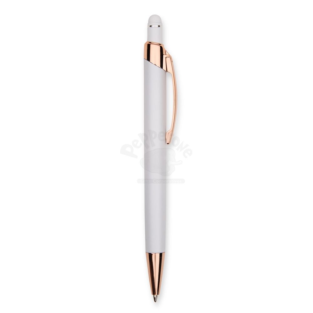 Caneta metálica com carga esferográfica azul de 1,0mm e acionamento por clique de revestimento emborrachado para interação em dispositivos com telas sensíveis ao toque.
