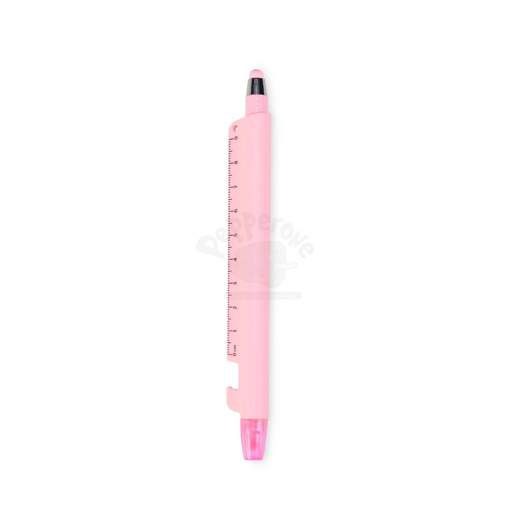 Caneta plástica marca-texto de ponta chanfrada com tampa protetora. Conta com uma régua de 9 centímetros e abridor de garrafas integrados ao corpo da caneta, além de uma caneta menor, destacável da estrutura principal, com ponteira emborrachada para interação com telas sensíveis ao toque e carga esferográfica azul de 1.0mm