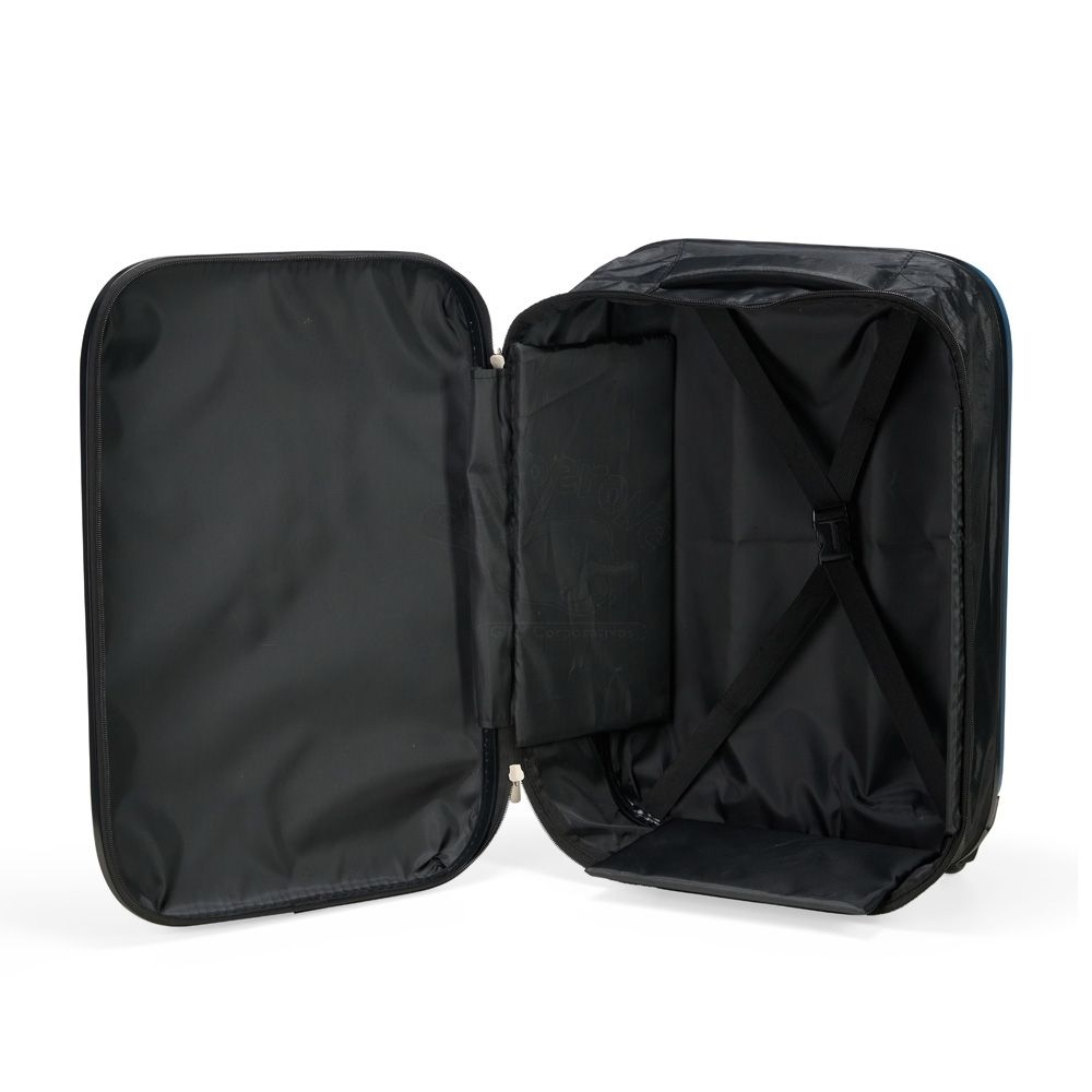 Mala de viagem expansível em ABS com bordas em poliéster que, ao ser expandida, comporta a capacidade máxima de 40 litros. Conta com forro interno em poliéster 210D, cinta compressora para roupas e placas rígidas em PVC que mantêm a armação da mala quando desdobrada. Dispõe ainda de duas rodinhas e alça retrátil em alumínio com puxador em plástico. Acompanha uma faixa em poliéster com seção elástica para envolver a mala dobrada.