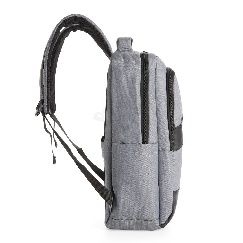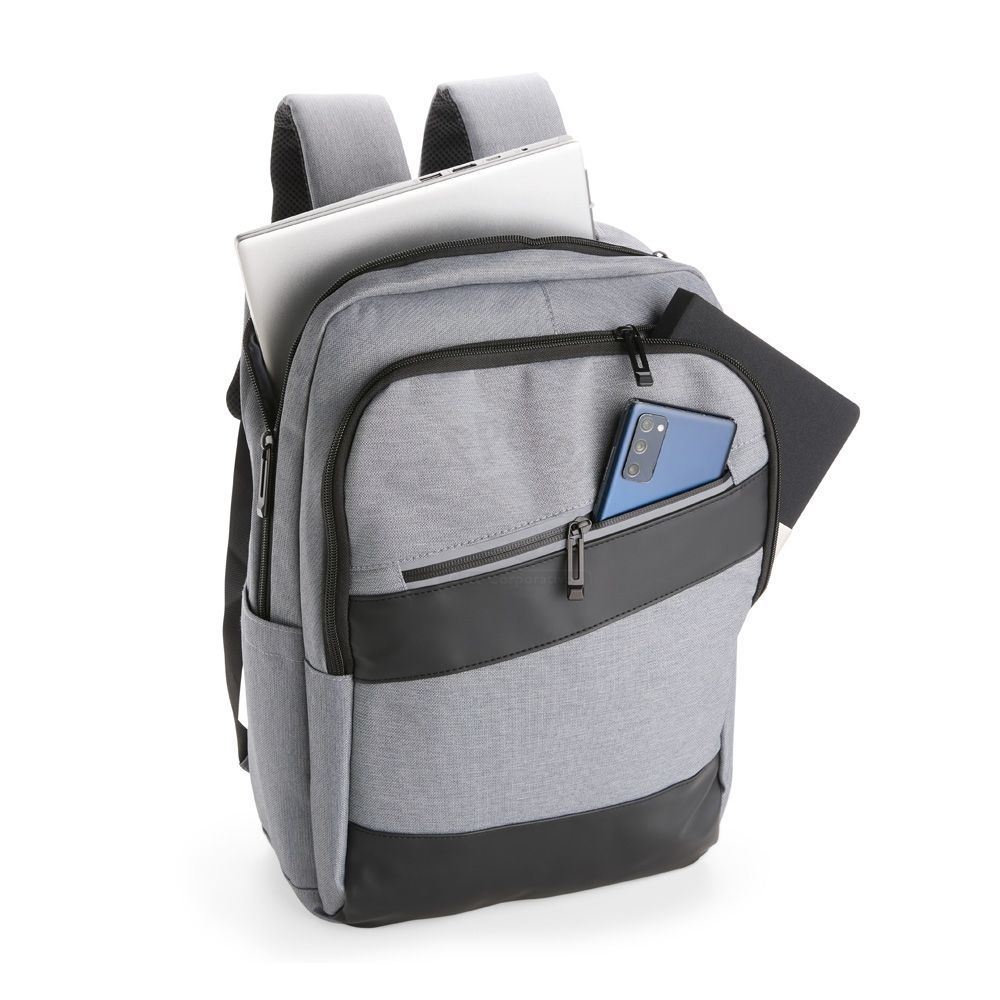 Mochila confeccionada em Oxford Jacquard impermeável com detalhes em couro sintético e capacidade de até 15,6 litros. Possui compartimento principal com bolsos em diferentes tamanhos e uma divisória para notebooks de até 15,3 polegadas. Conta com entrada externa para cabos USB-A e USB-C, dois compartimentos frontais com zíper e dois bolsos laterais abertos. Dispõe ainda de alça superior, duas alças de costas e painel traseiro acolchoados, além de engate em nylon para malas de viagem.