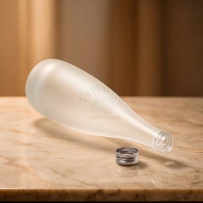 Garrafa de vidro com acabamento fosco, tampa rosqueável em alumínio e capacidade máxima de 550ml.