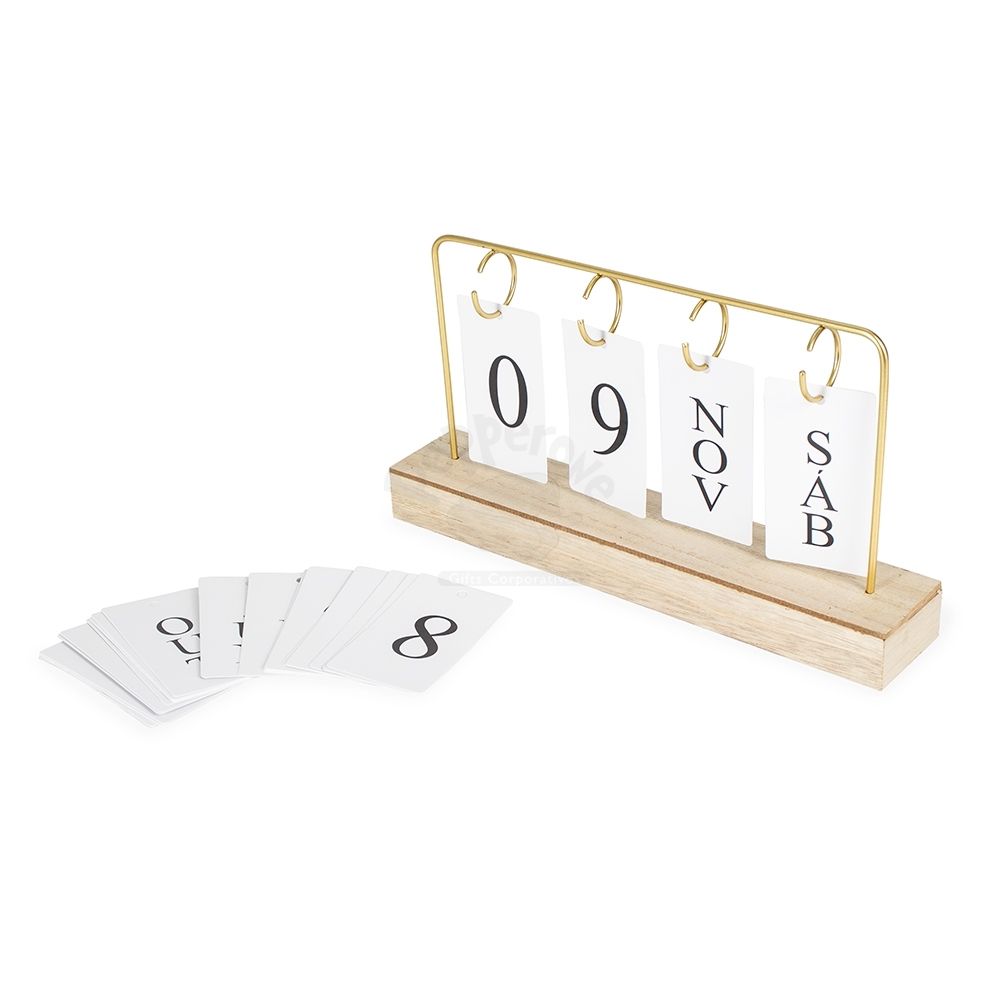Calendário permanente de mesa com base feita em MDF e moldura de ferro. Conta com fichas em papel cartão que permitem montar a data, trazendo o dia em números e o mês e os dias da semana em versões abreviadas.